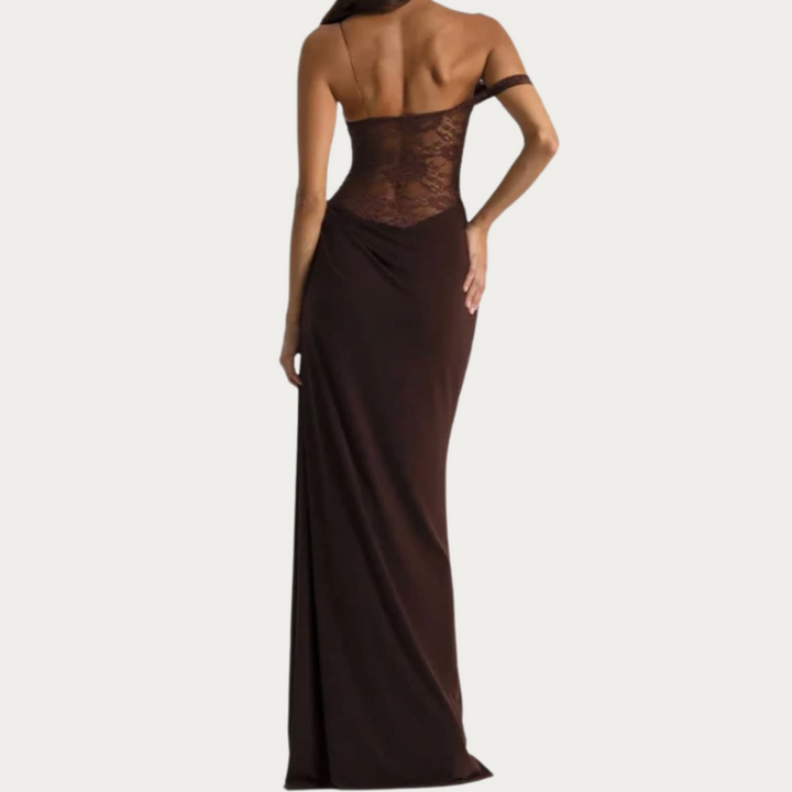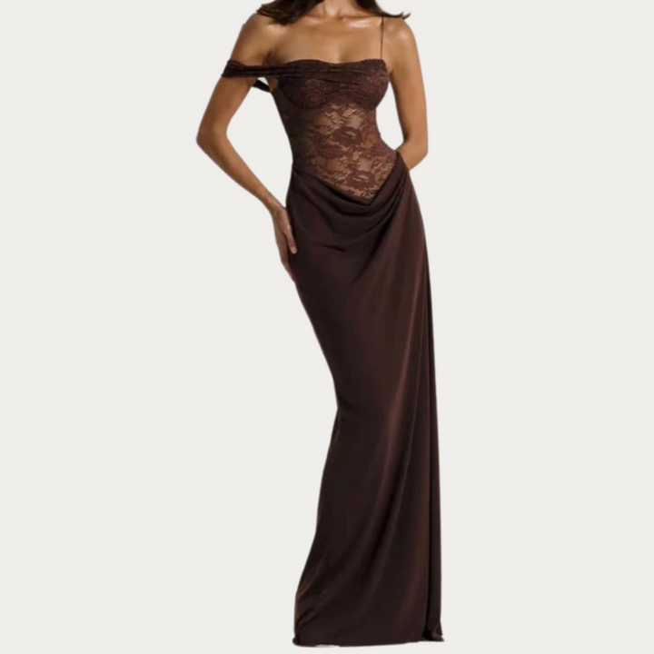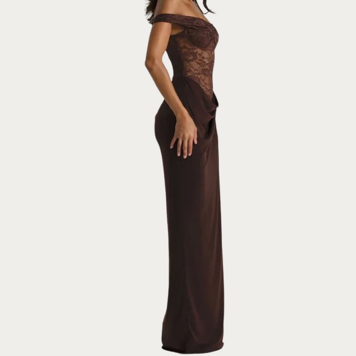 De doorschijnende kanten lijfjespartij straalt subtiele allure uit, terwijl de verfijnde draperie bij de taille een vleugje elegantie toevoegt. De off-shoulder bandjes en het figuurvolgende silhouet brengen een romantische toets, terwijl de vloeiende maxi-rok bij elke stap sierlijk meebeweegt. Perfect voor gala’s of avonden die vragen om compromisloze glamour — de Bacela belichaamt moderne verfijning.